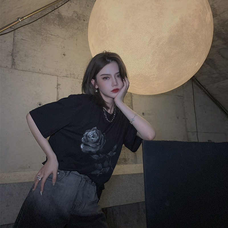 【黯夜玫瑰】 安晴高定夏季新款设计感玫瑰花白色短袖T恤上衣女热门设计联盟服务商